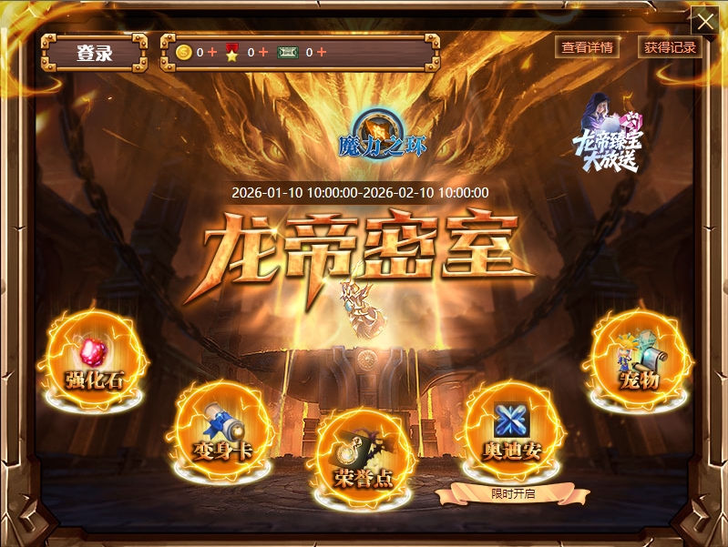2026年好运连连,开年好礼!龙帝密室活动已正式由每月限时开放调整为常驻模式,玩家可随时通过游戏内商城入口进入参与。同步开放的魔力之环、龙帝臻宝玩法,活动奖励道具将不间断焕新,更多惊喜等待你前往龙帝密室探索~