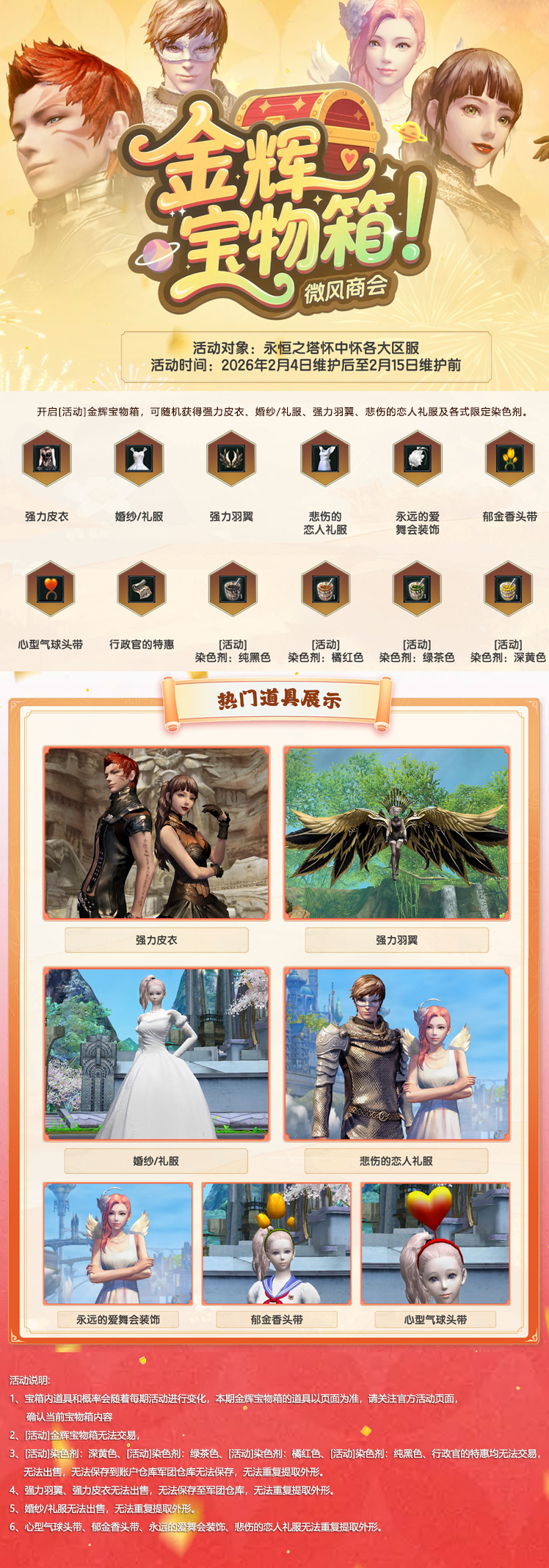 - 2월 4일부터 15일까지 미풍 상회의 금휘 보물 상자를 구매하면 강력한 가죽 갑옷, 결혼 드레스/정장, 파워 플레이트, 슬픈 연인 의상 등 다양한 아이템을 랜덤으로 획득할 수 있습니다.
