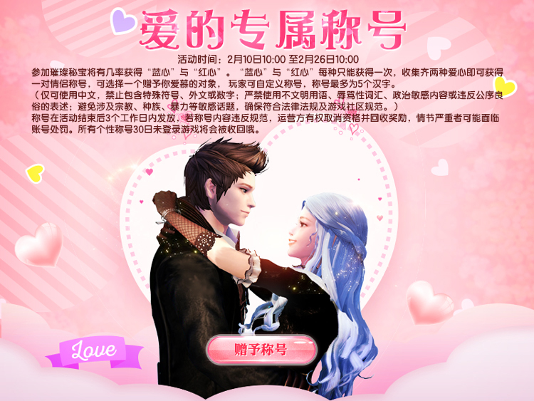 2月10日10:00至2月26日10:00,参加璀璨秘宝将有几率获得“蓝心”与“红心”。“蓝心”与“红心”每种只能获得一次,收集齐两种爱心即可获得一对情侣称号,可选择一个赠予你爱慕的对象, 玩家可自定义称号,称号最多为5个汉字。