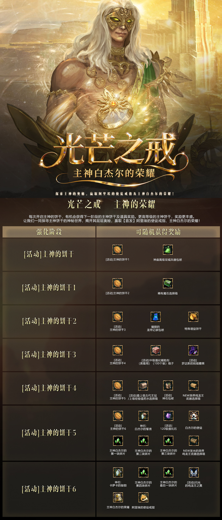 | [活动]主神的饼干 | 3000守护点 | 开启[活动]主神的饼干,有机会获得下一阶段的 主神饼干及道具奖励。 热门奖励:阿里埃的使徒戒指、 主神白杰尔的荣耀、[活动]闪光的鸣龙王之翼、 NEW发光的异界鸣龙王武器选择箱。 |