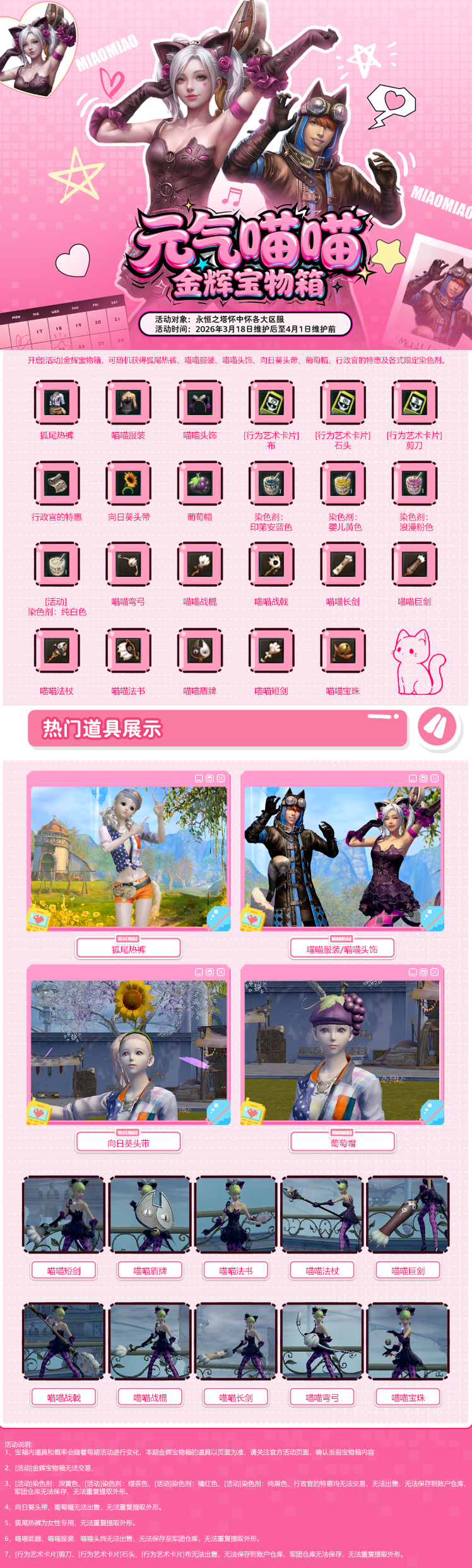 甜心暴击来袭,金辉宝物箱萌趣上新!时尚经典狐尾热裤闪亮登场,软萌可爱的喵喵系列服饰、武器惊喜亮相,更有趣味十足的[行为艺术卡片]石头/剪刀/布,助你在亚特雷亚大陆增添无限欢乐。向日葵头带、葡萄帽、行政官的特惠及染色剂包袱等多款珍稀宝物齐聚,多重惊喜等你来开启!(立刻购买>>)