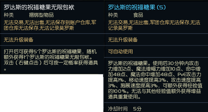 | 罗达斯的祝福糖果无限包袱 | 3000守护点 | 打开后可获得 5个罗达斯的祝福糖果, 随机额外获得 1个罗达斯的祝福糖果无限包袱。 |