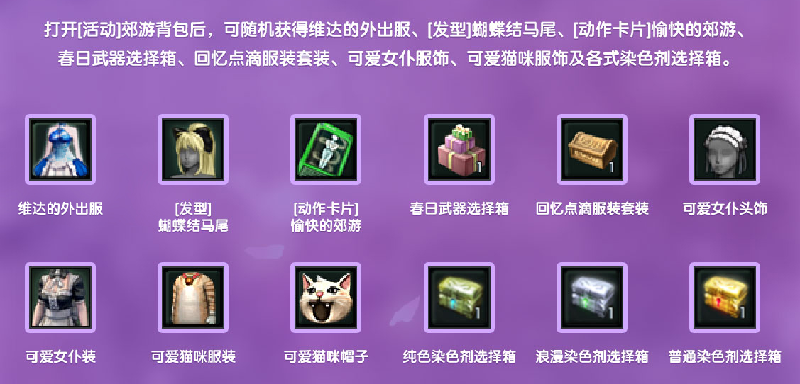 | [活动]郊游背包 | 2800守护点 | 开启后随机获得维达的外出服、 [发型]蝴蝶结马尾、[动作卡片]愉快的郊游、 回忆点滴服装套装、可爱女仆装/头饰、 可爱猫咪帽子/服装、 普通/浪漫/纯色染色剂选择箱。 |