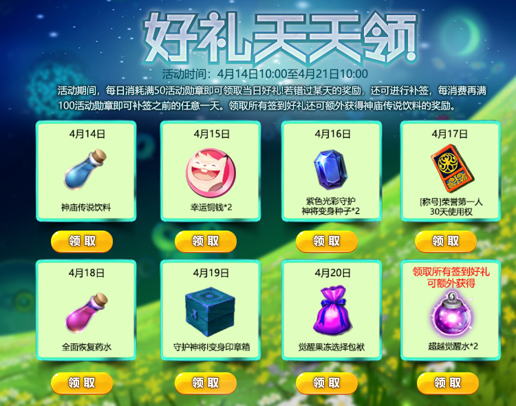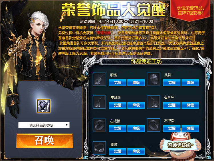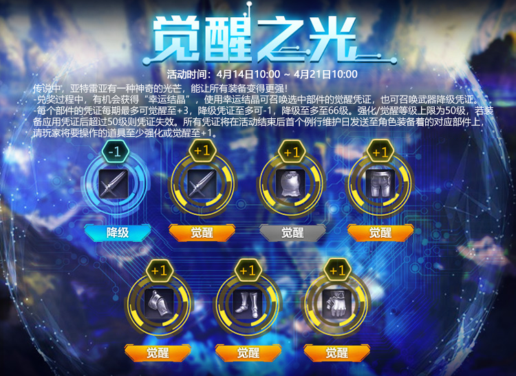 觉醒凭证、强化凭证等奖励,将在活动结束后的例行维护日统一发放,请获奖玩家将要操作的道具装备在身上,并至少强化或觉醒至+1,如未装备视为自动放弃。