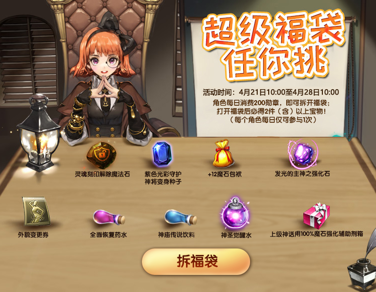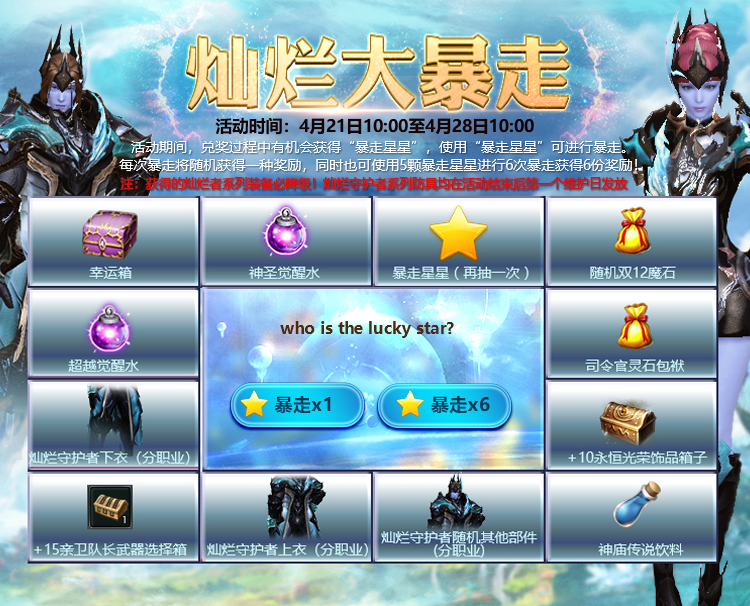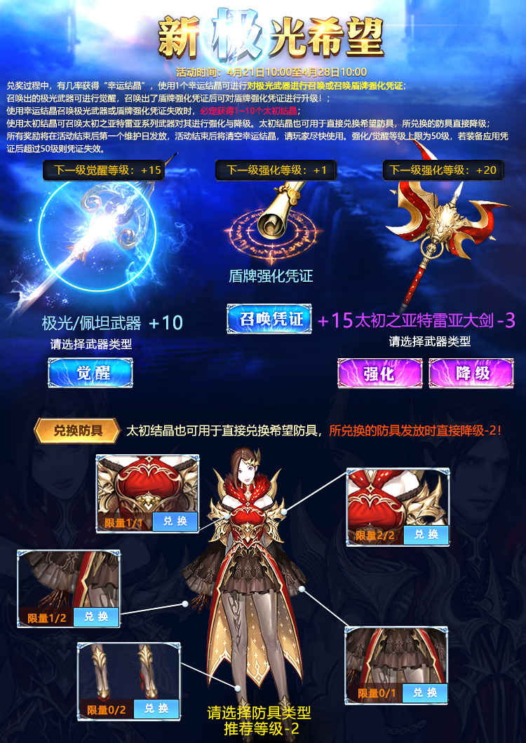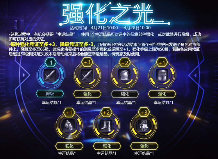 觉醒凭证、强化凭证等奖励,将在活动结束后的例行维护日统一发放,请获奖玩家将要操作的道具装备在身上,并至少强化或觉醒至+1,如未装备视为自动放弃。
