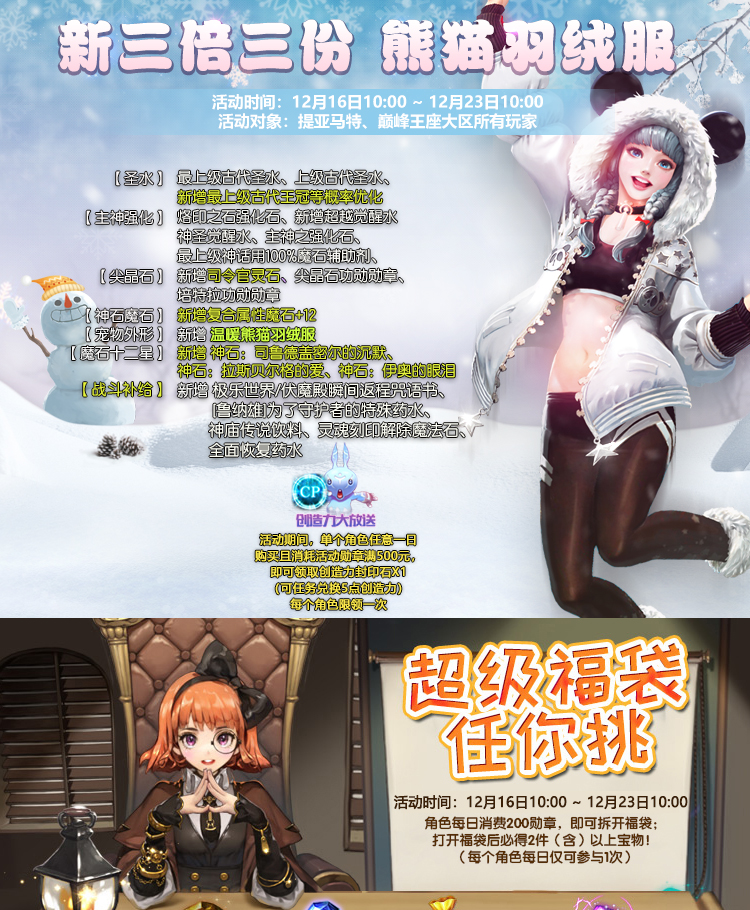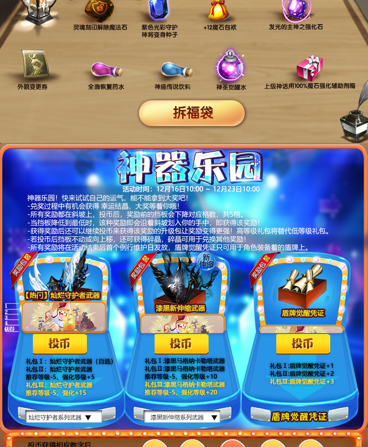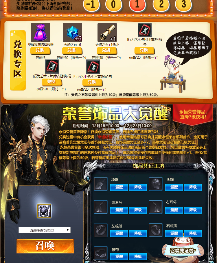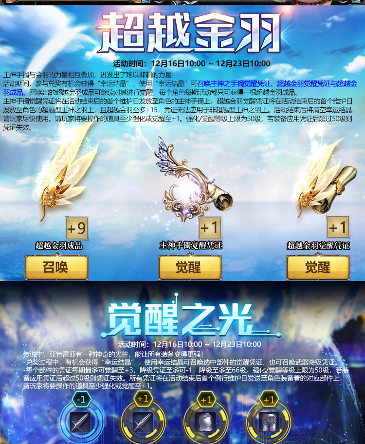 觉醒凭证、强化凭证等奖励,将在活动结束后的例行维护日统一发放,请获奖玩家将要操作的道具装备在身上,并至少强化或觉醒至+1,如未装备视为自动放弃。