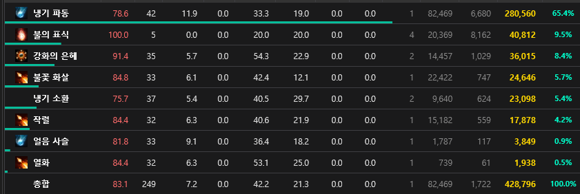 냉기파동의 경우에도 처음 5회정도까지는 적용이 되다가 이후 스킬들 데미지가 낮게 잡힘